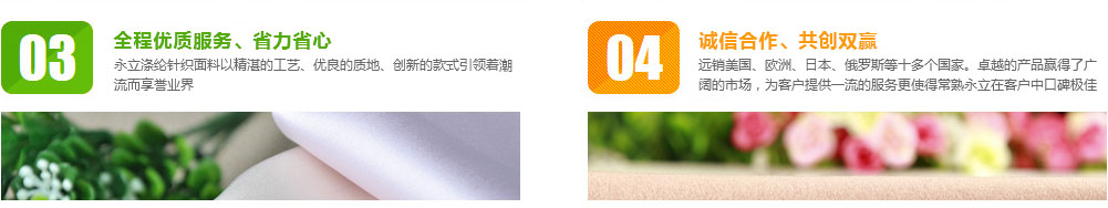 公司成立于1997年,坐落于風(fēng)景秀麗的虞山腳下,位于中國經(jīng)濟最活躍的版圖--長江三角洲經(jīng)濟技術(shù)開發(fā)區(qū)的黃金地段上,常熟市永立針紡織有限公司,伴隨著中國針紡織品行業(yè)蓬勃發(fā)展,走過了10多年的創(chuàng)業(yè)歷程,如今已發(fā)展成為一家集工、貿(mào)于一身,在行業(yè)內(nèi)聞名遐邇的專業(yè)生產(chǎn)滌綸針織面料的特色企業(yè)。本公司擁有來自臺灣的先進制造設(shè)備,以雙面小提花機為主的34寸(16--45針)雙面緯編機50臺、34寸(20--50針)單面開幅機9臺、36寸 22針德國邁耶OVJE雙面電腦大提花機6臺及其他先進設(shè)備。憑借著一流的設(shè)備,以及“人無我有,人有我好,人好我轉(zhuǎn)”的經(jīng)營理念,常熟永立一直致力于滌綸面料的創(chuàng)新...